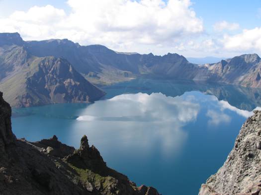The Crater Lake:- It nestles on Baitoushan (The White-Head Mountain), the main peak of the Changbaishan and is also a border lake between China and Korea. Surrounded by 16 exotic peaks, the lake is the crater of a volcano, filled with blue waters, known as "The Heavenly Lake". The basin-shaped lake, 2155 meters above sea level, and 313 meters deep at maximum, encompasses an area of 9.2 square kilometers. It's a typical high mountain lake. The lake waters keep flowing out, without causing apparent change in its water level. The two white rivers of the upper reaches of the second Songhua River originate here. The inner side of the lake bank is craggy cliffs formed by rough-surface rocks and white pumice stones, which make the Lake resemble a marble bowl carved with uncanny workmanship. The surface of the Lake is smooth as a mirror, with the reflections of grotesque cliffs upon it in numerous exotic shapes.